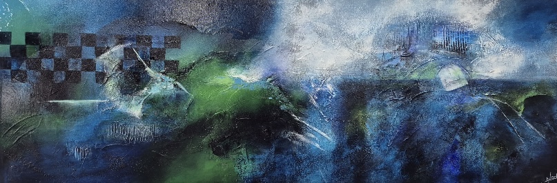 Cette démonstration portera sur une toile abstraite contemporaine au format 40 × 120 cm, réalisée à partir de techniques mixtes :