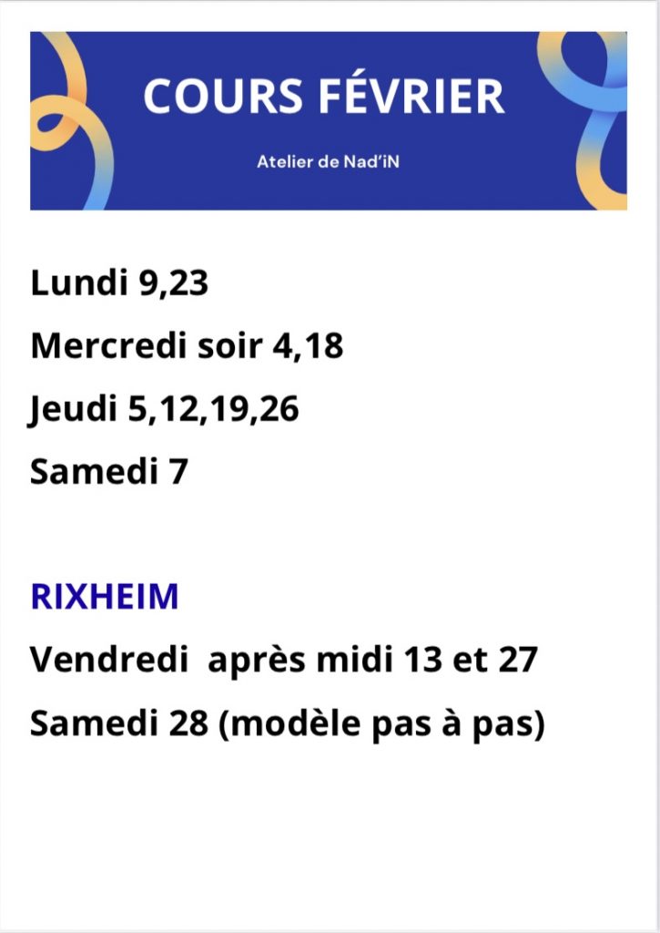 Les cours de peinture du mois de février se dérouleront aux dates indiquées sur le visuel ci-dessous.