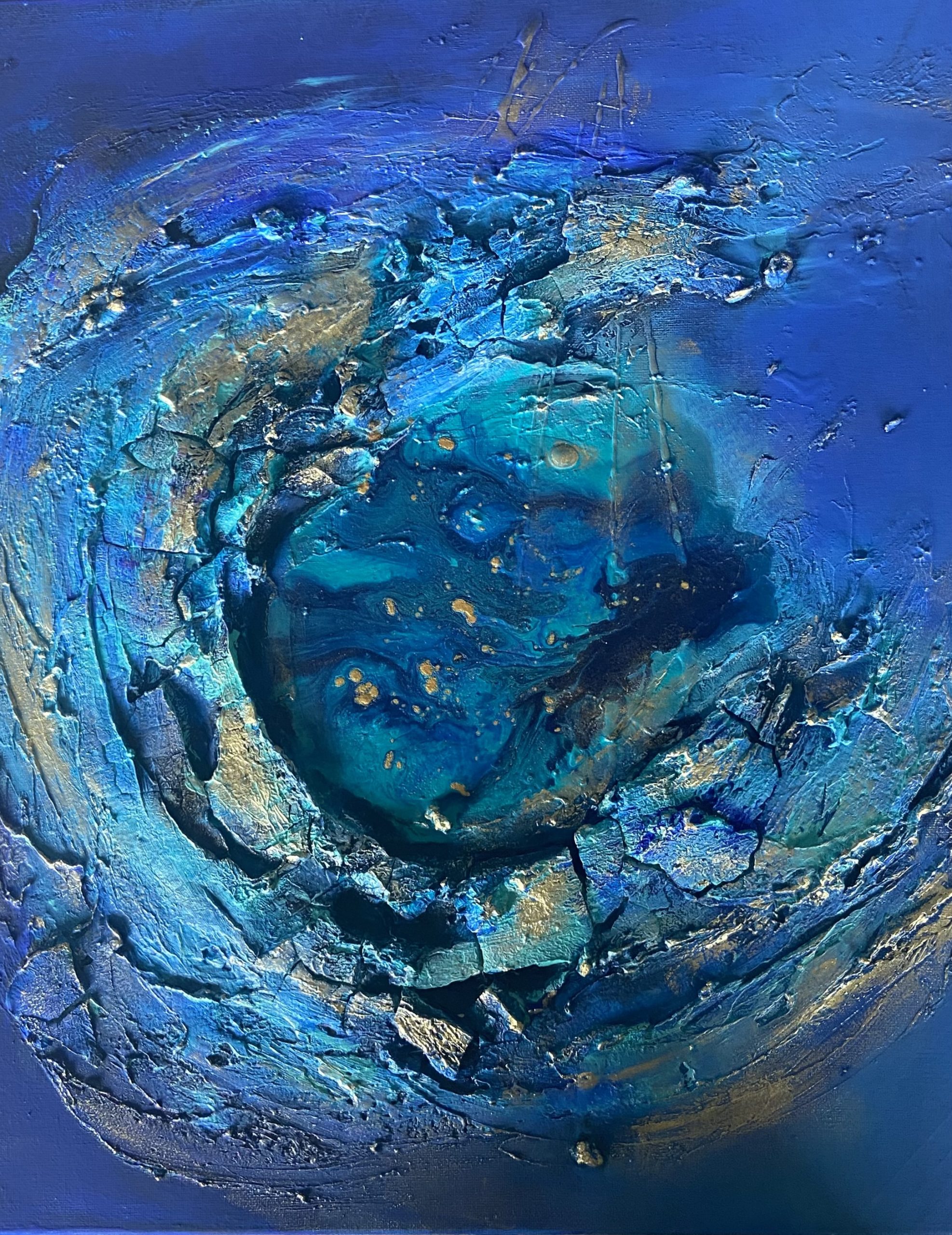 Plongée au cœur des profondeurs bleutées, cette toile invite à un voyage intérieur où matière et lumière s’unissent dans un mouvement circulaire. Entre vortex aquatique et spirale cosmique, elle évoque à la fois l’origine et l’infini, la force créatrice et la douceur enveloppante.