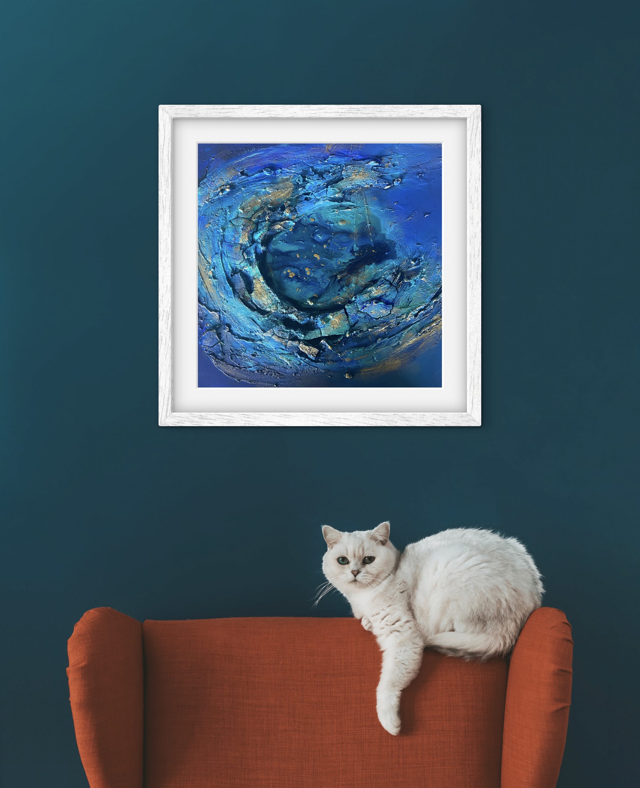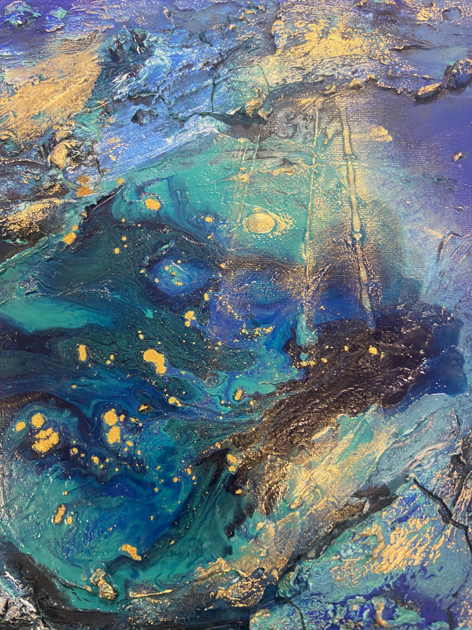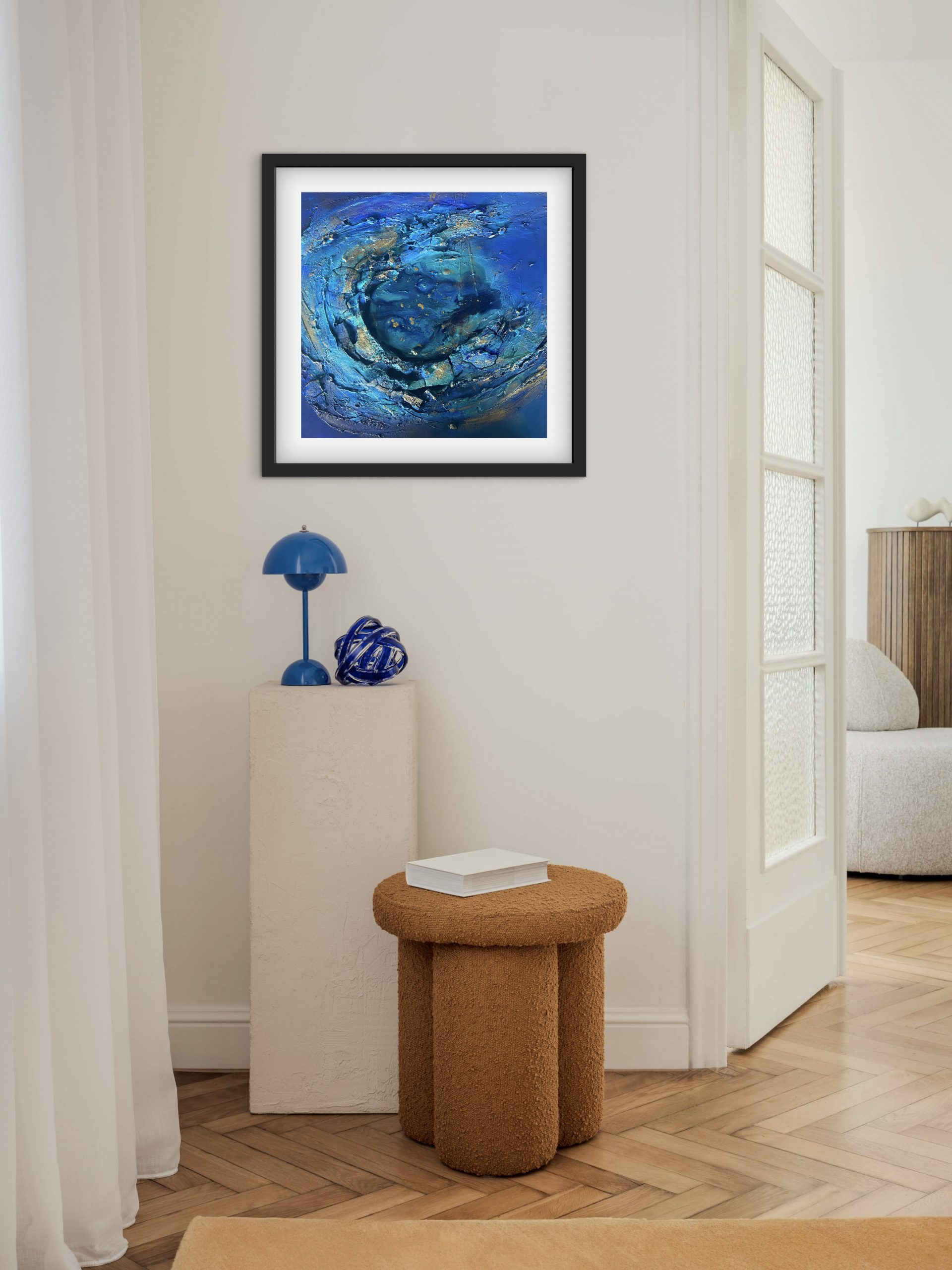 Les nuances de bleu, sublimées par des éclats dorés, rappellent les mystères de l’océan autant que ceux de l’univers. Chaque relief, chaque texture raconte une énergie en mouvement, une transformation en cours, une invitation à se laisser porter par le souffle de l’instant présent.