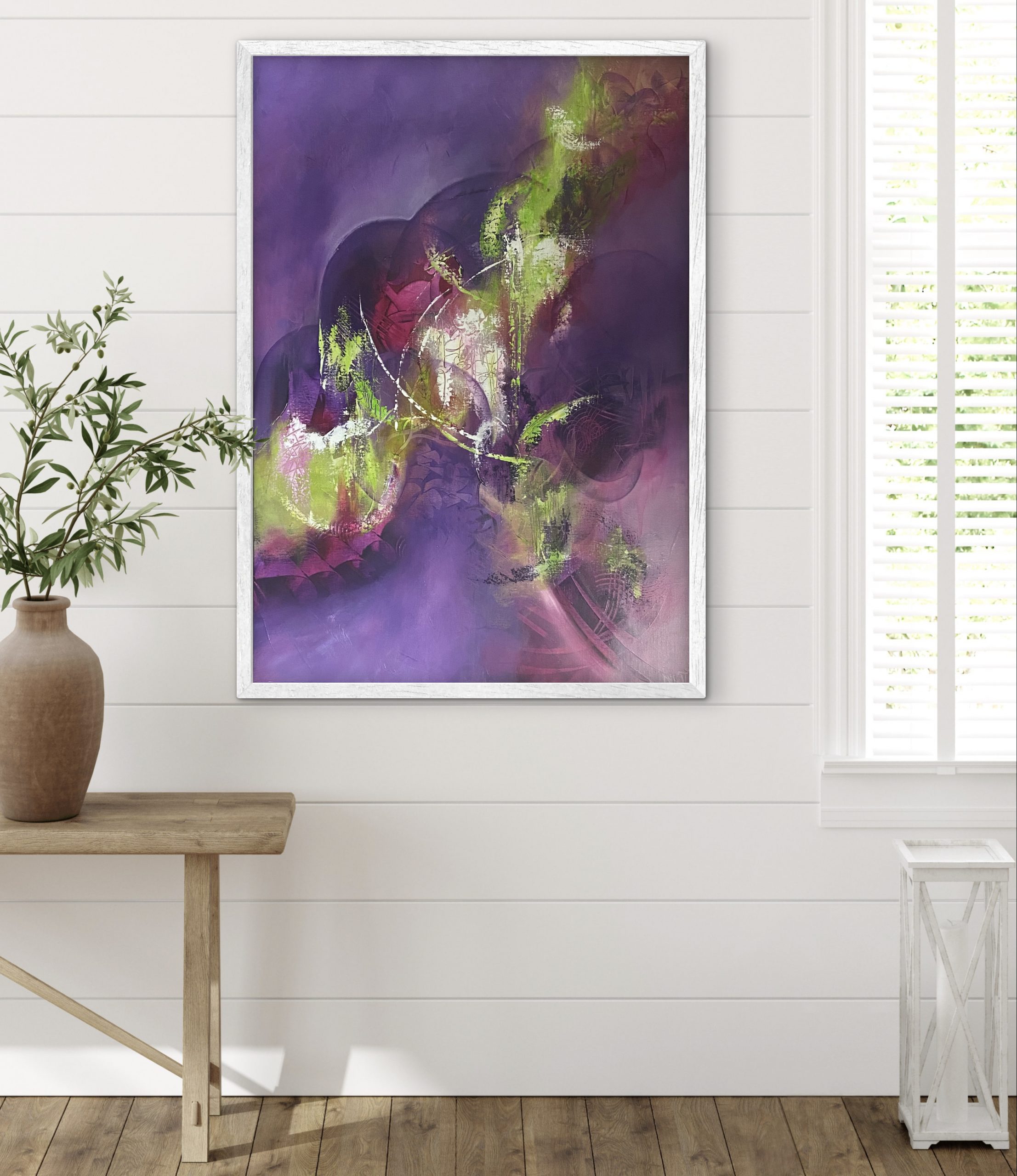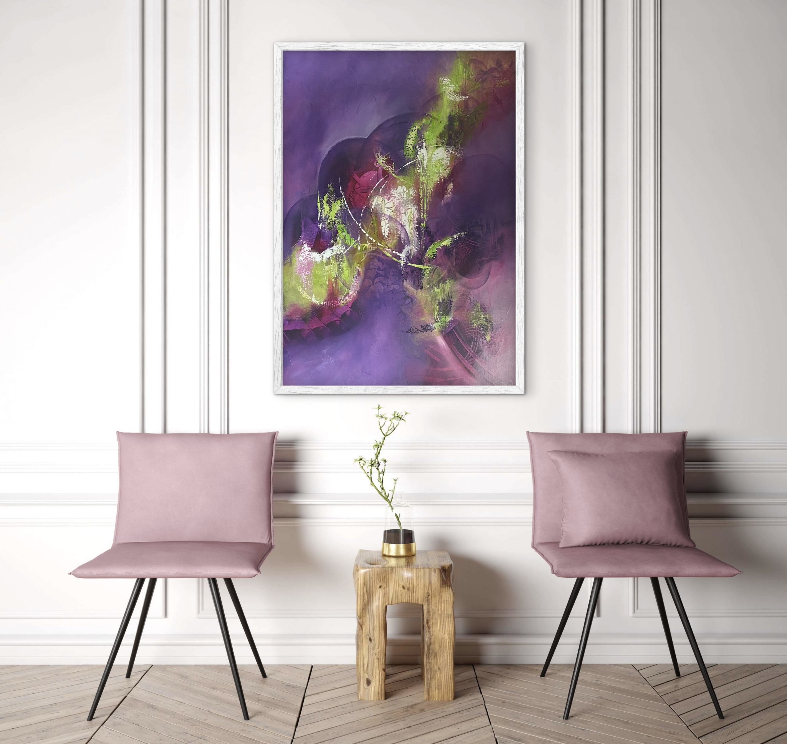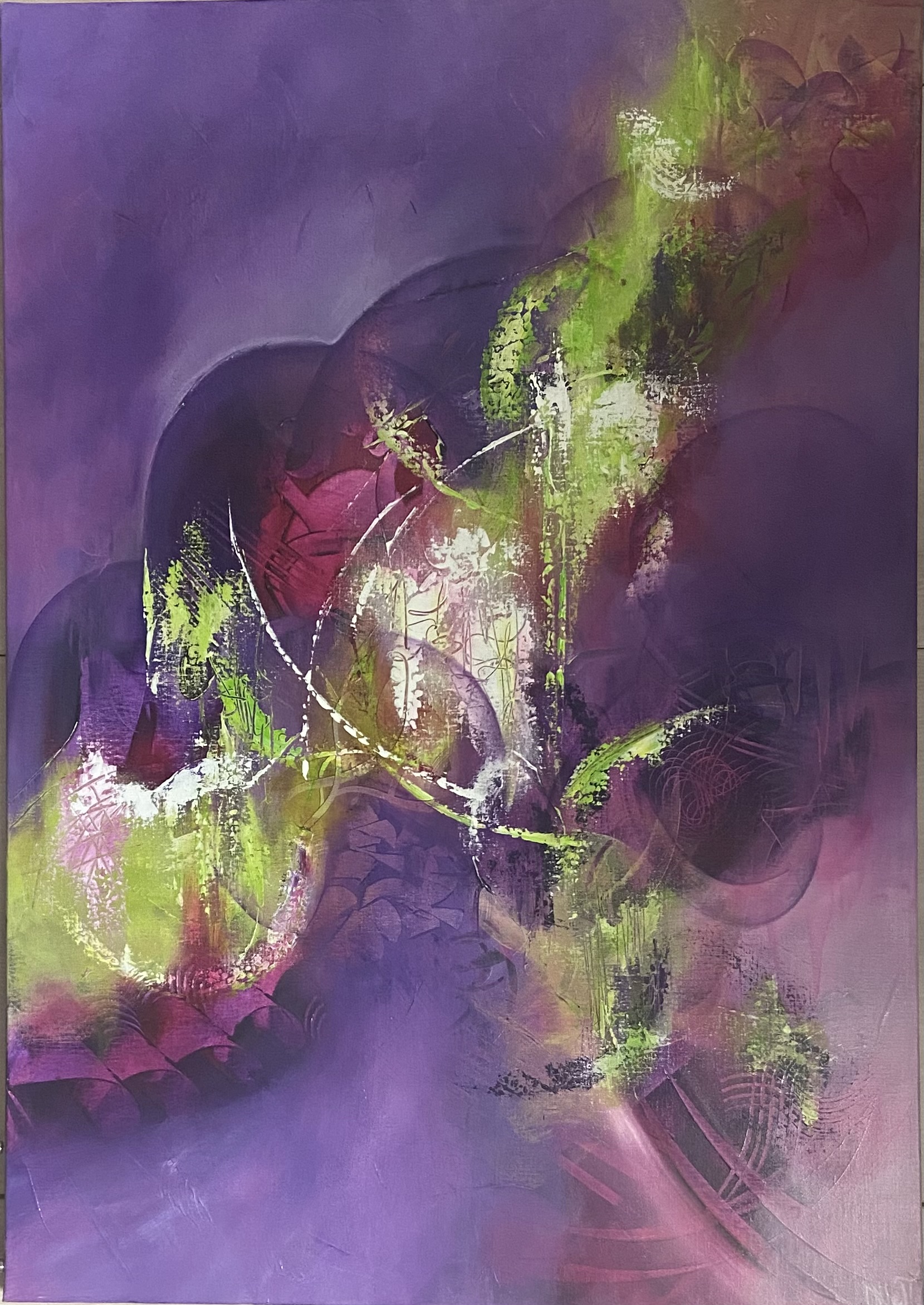 Paradoxe est une œuvre vibrante et contrastée, où les violets profonds rencontrent des touches vertes lumineuses et des nuances rosées. La superposition des matières et des formes crée un dialogue subtil entre force et délicatesse.