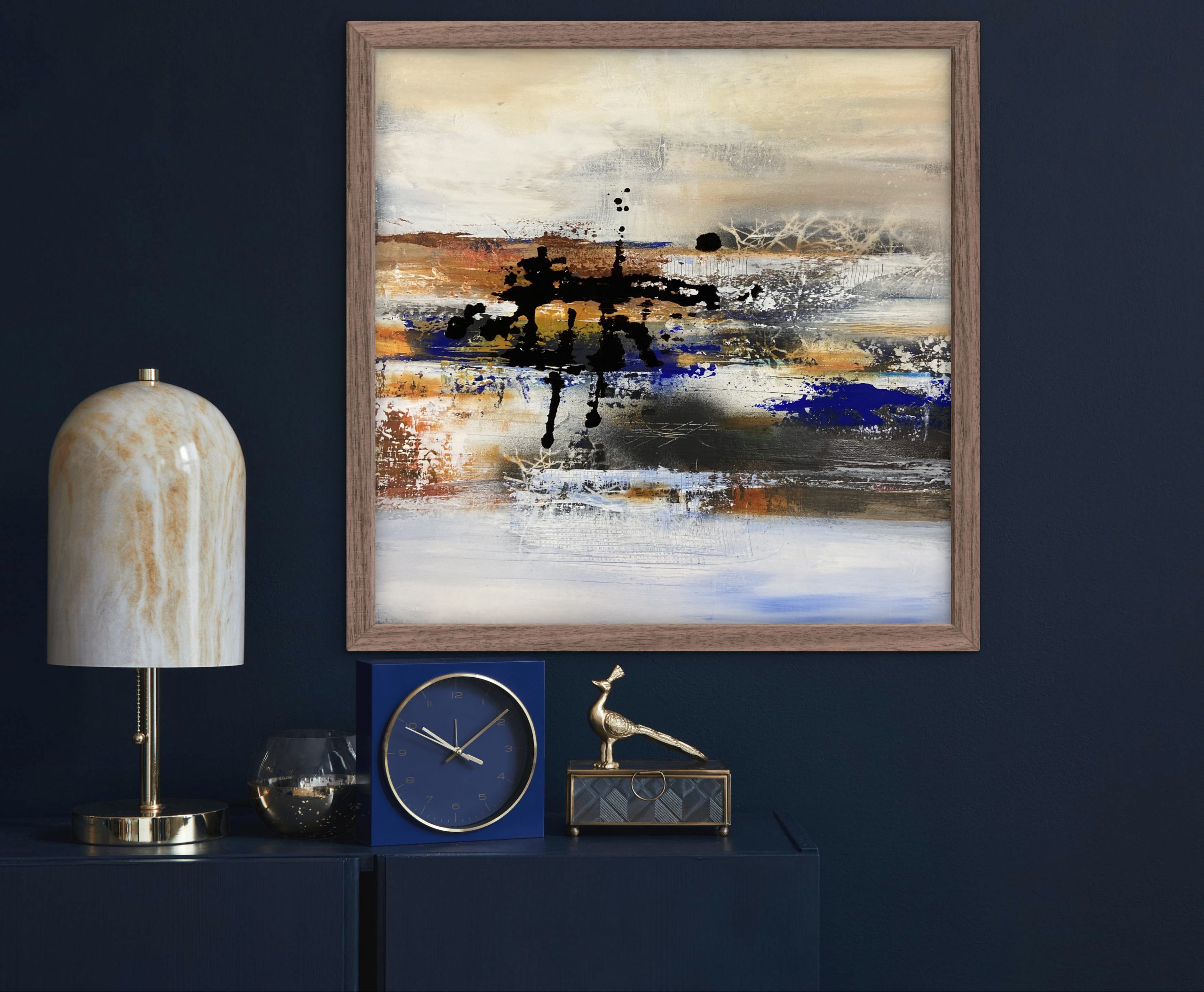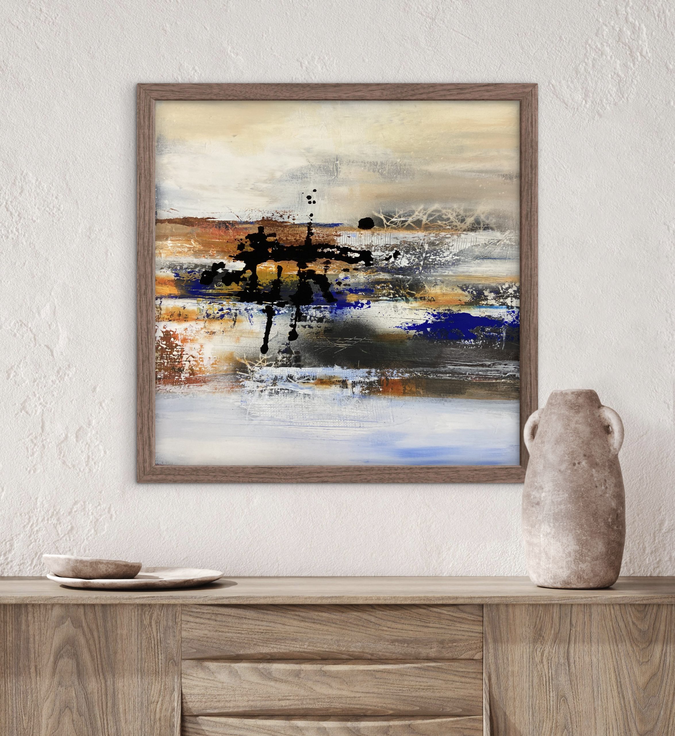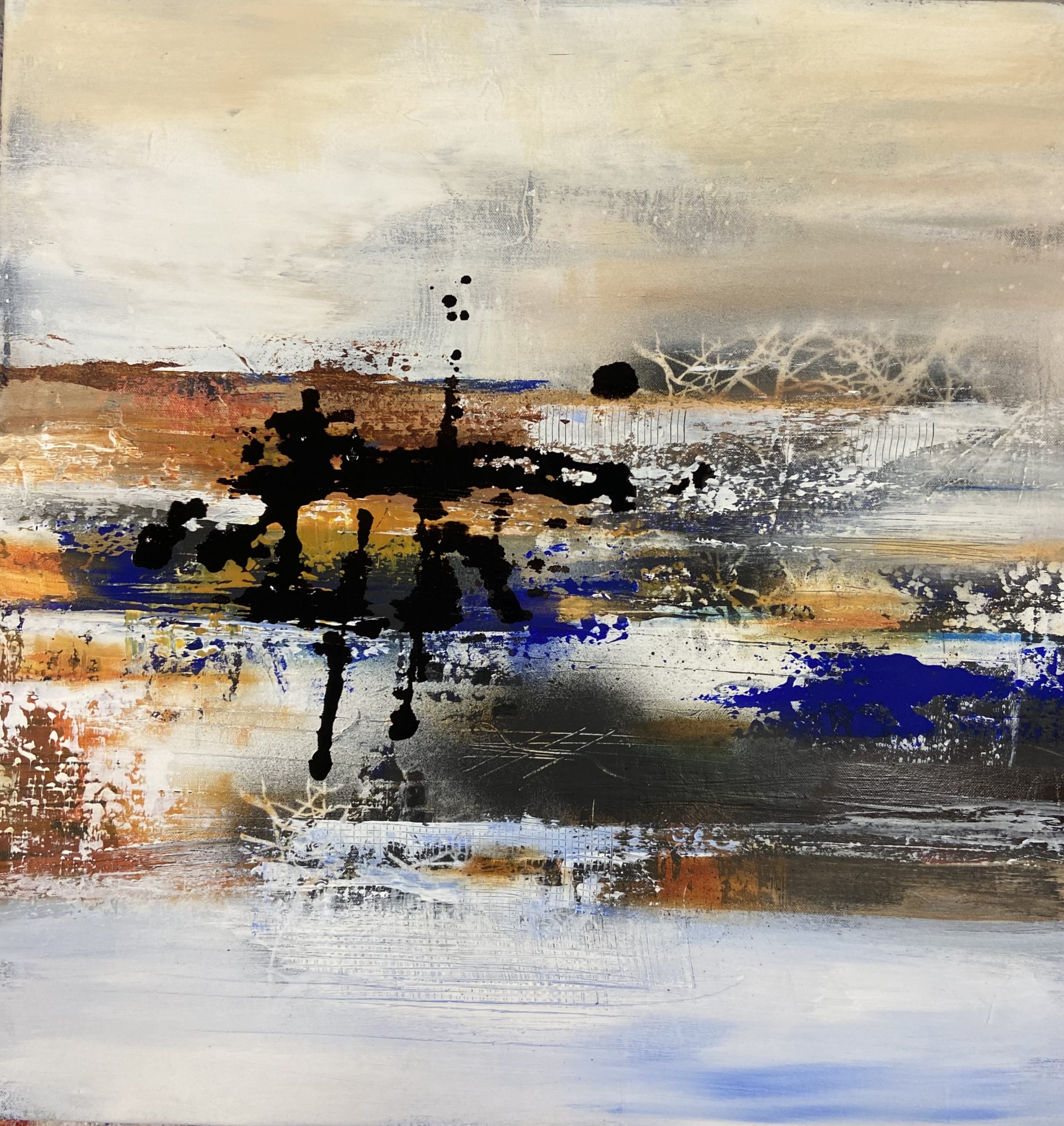Horizons Intérieurs évoque un paysage ressenti plus que vu. Des strates de couleurs, de matières et de silences se superposent comme des souvenirs lointains. Le noir ancre, le bleu ouvre l’espace, l’ocre réchauffe. Une œuvre née de la contemplation, entre retenue et profondeur, là où l’horizon devient émotion.